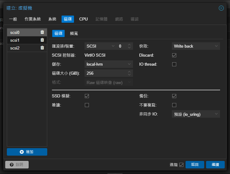 3.4. 磁碟設定,加入三個相同規格的虛擬磁碟,之後用來建立 RAID 的磁碟集區