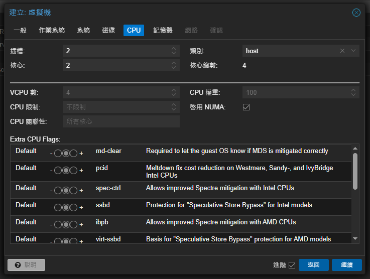3.5. CPU 設定,選擇 host 取得最好的虛擬核心效能,啟用 NUMA 讓 DSM 可以使用 Container Manager